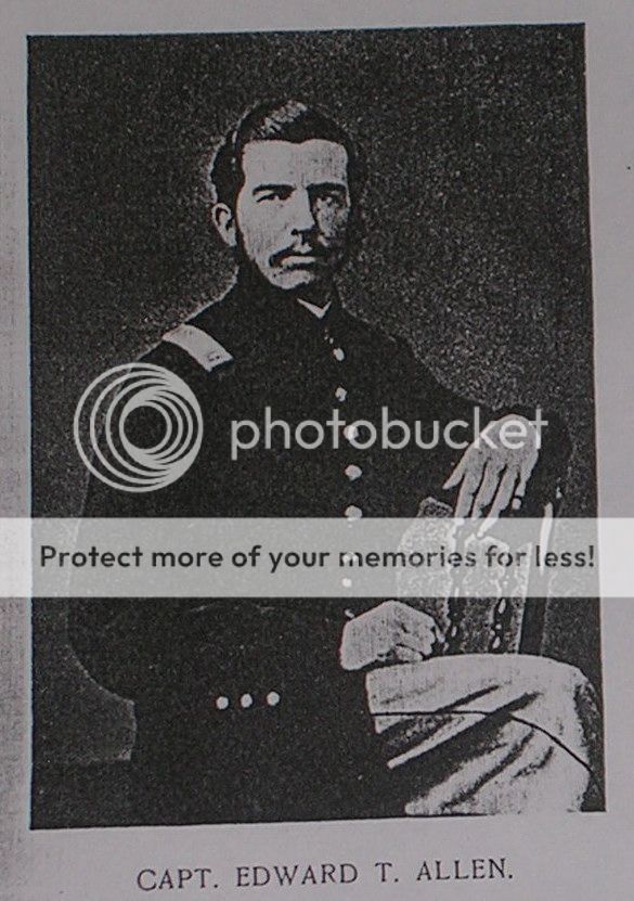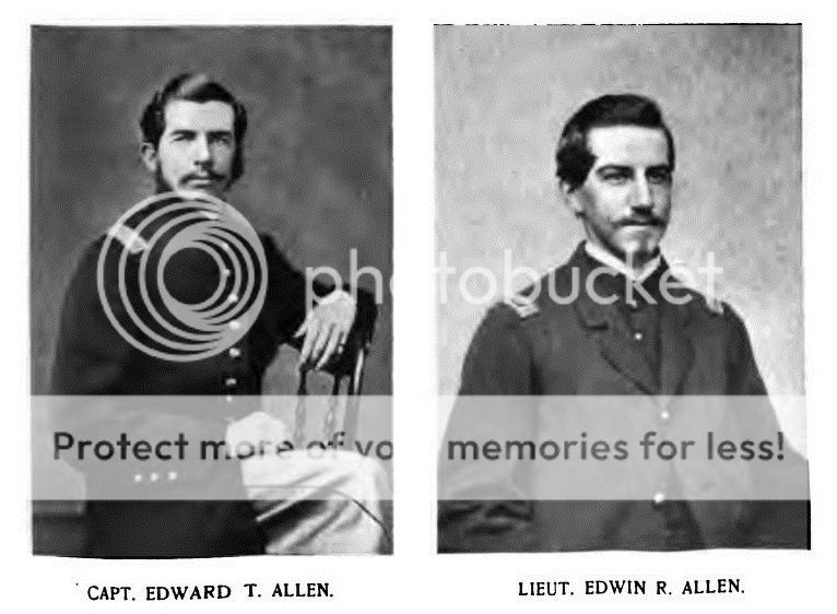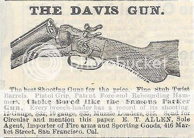 Although I’m told Parker only produced around four hundred of the big 8 gauge doubles, it seems a number of them were sold through The E.T. Allen Company, with what I understand to be several accounts of these guns being shipped in multiples. Considering the market hunting present in California’s Central Valley wetlands at the time, where ducks and geese all but blotted out the sun on occasion, the value of the 8 gauge can be easily understood. http://i433.photobucket.com/albums/q...pspbzr9g4k.jpg Results of a morning hunt in the Central Valley wetlands just after the turn of the 20th century. Reportedly taken in the area around Willows, California, which lies about 125 miles due north of San Francisco. http://i433.photobucket.com/albums/q...psv5blhcwi.jpg Cpt. Edward T. Allen in an undated photo, probably around 1863-64. Edward Tracy Allen was born November 1, 1838 in Windham County, Connecticut, the oldest of three brothers. His father was Edwin Allen, a manufacturer of wood printing type. His brother Edwin R. served alongside Edward as a 1st lieutenant in the 7th Regiment of Rhode Island Volunteers and eventually as lieutenant governor of Rhode Island. His brother Charles N. worked as a manufacturer in Connecticut and at one time was acting assistant engineer of the United States Navy. His early education was obtained in the district schools of his town and finished at Hall's Academy, Ellington, Conn. At the age of eighteen he entered the store of S. Robinson & Son, Wakefield, R.I., and continued there until enlisting in the military on or about September 4th, 1862. http://i433.photobucket.com/albums/q...psjbjemmbz.jpg Another version of the prior photo showing both Edward and his brother Edwin R., future lieutenant governor of Rhode Island, during their period of military service in the Civil War. Originally joining the Narragansett Guards, Allen was commissioned a Second Lieutenant and given the job of recruiting men for what became Company G of the 7th Rhode Island Volunteer Infantry in August 1862. In January of 1863, Allen was promoted to First Lieutenant and reassigned as commander of Company A after the company's previous commander was wounded. He was officially promoted to the rank of Captain in May 1863. Allen was soon temporarily reassigned to a unit which would be involved in the pursuit and capture of Confederate Brigadier General John Hunt Morgan during his July 1863 raid north. Afterwards, Allen returned to the 7th Rhode Island where he served until June 1864, when he was seriously wounded on June 18th, 1864 by a musket ball in his left leg on the march to Petersburg. He was conveyed to the Armory Square Hospital, Washington, D. C., whereupon he was honorably discharged for resulting disability on July 29th, 1864. In 1865 he was employed at a hardware and gun house in New Haven, CT, whereabouts he remained for the following decade. For a third of that time, at least, he was connected with a machinery manufacturing company, and in such a manner as to frequently necessitate visiting the Provinces. The year 1866 was spent, however, in California. On April 30 1867, he married Elizabeth Clarke, daughter of Col. Geo. W. and Ann Frances Cady Sheldon, of Wakefield, Rhode Island. No children were born to them, but in July of 1886, he informally adopted those of Mrs. Allen's sister Emma, who died Oct. 12, 1886, leaving twin daughters Emma S. and Anna C., only two days old, and a son, George W., born June 8, 1885. Their father, William Allen Kenyon, died Dec. 16, 1887, at Wakefield. Edward’s health, having been shattered by the exposures of prolonged campaigns and the bullet wound suffered near Petersburg, did not fully return. Seeking a more favorable climate he moved west to San Francisco in October, 1875. He brought with him samples of various arms, guns, pistols, cutlery, and other articles representing the Whitney Arms Company and John P. Lovell and Sons. He rented a store at 515 Market Street, but soon outgrew these quarters and moved to 416 Market Street, eventually becoming one of the important suppliers of sporting goods on the West Coast. He was an agent for the following companies: John P. Lovell’s and Sons, Boston; N.R. Davis & Sons, Freeport, Mass.; Whitney Arms Company, New Haven, Conn.; Excelsior Cutler Co., Northfield, Conn. He also manufactured hunting clothes, loading tools, and other items along these lines. English guns and gunware were imported and all American styles and makes were stocked. Though Allen was not a gunsmith, he always employed a gunmaker, undoubtedly for making special orders using the English gunware. One of the more noted gunmakers that worked for him was David Thom. http://i433.photobucket.com/albums/q...psukvyjlfi.jpg A period ad for the "Davis Gun" offered by the E.T. Allen Co., San Francisco. Allen’s name first appears in the San Francisco City Directory (Langley) of 1877. He is listed first on p.94 as follows: “Allen, Edward T., commission merchant, 330 Sansom, 35 South Park.” I’m left to assume the Sansom address was his office and 35 South Park was his residence, in accordance with how later addresses were formatted in the city directory. The 35 South Park address is today residential in nature with what may be surviving period structures and lies approximately six blocks SSE of the Market Street address. He is again listed on p. 991 of this directory under the “Merchants-Commission (*Importers)” section as follows: “Allen Edward T., 330 Sansom(e).” The modern spelling is Sansome, but numerous entries of the period lead me to believe it was originally spelled without the e. Entries in the city directory are relatively consistent over the following years; a few random samples are included below: • Listed in the 1879 Langley directory as “Allen Edward T., manufacturer’s agent hardware, cutlery, and firearms, 515 Market, r. 19 Guy Pl” • Listed in 1881 Langley Directory on p. 105 as “Allen Edward T., mnfr