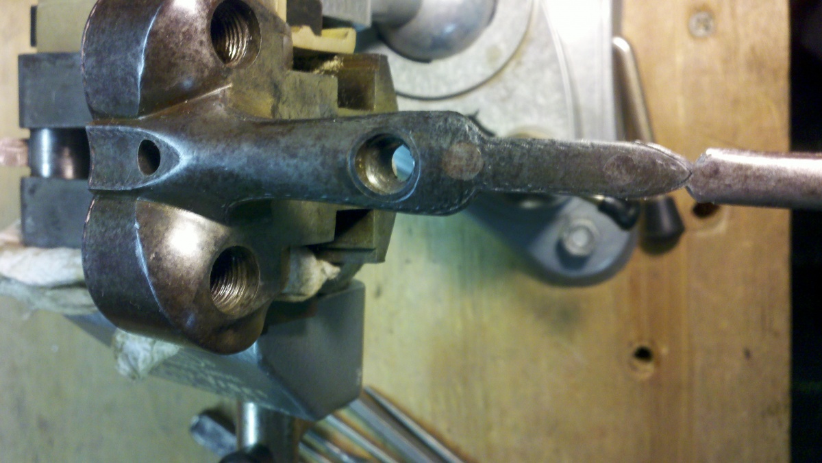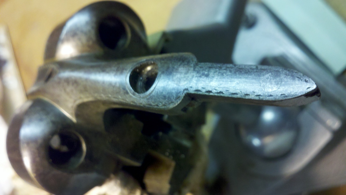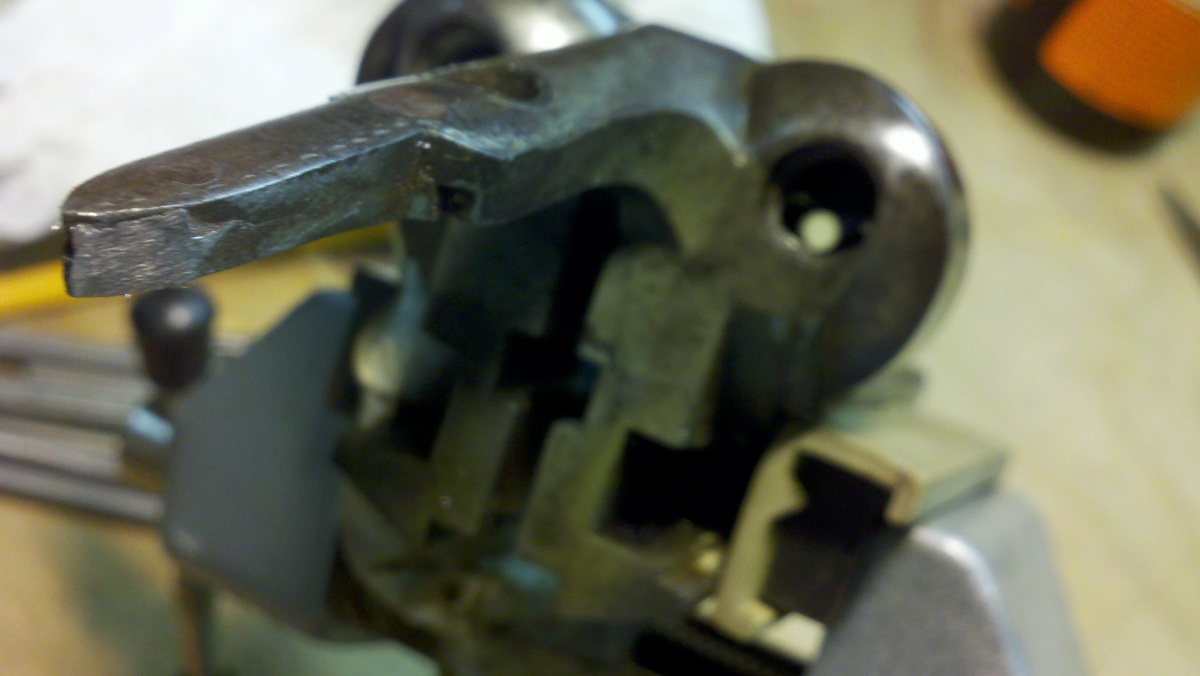 Here's a pick of the donor rebounding lock. Notice the mainspring resting on the stop and the rounded bottom of the tumbler. |