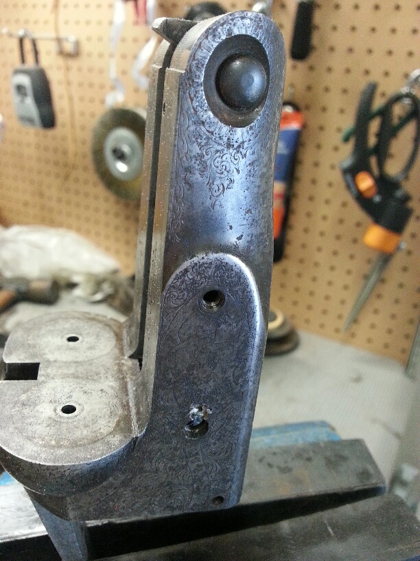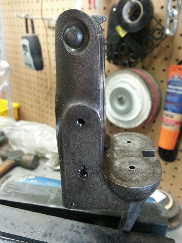 And we have a winner with John's critical eye. I have never removed a roll pin and the roll but I have these orphaned frames and 3 still had the roll and pin. I decided to play. I removed the roll and pin from a Trojan and learned it takes pretty hefty smacking. Also learned if I wanted to do this with a good gun not to use a flat punch. When I inserted this assembly into the D frame, it was a bit tighter than when in the Trojan. I remembered a set of punches with a round face and that didn't flatten the pin when re-inserting. Anyway, just playing today and definitely a D should have the slotted screw and pin, which are two pieces. I have started to appreciate the refinements in the Trojan, which were really cost cutting I'm sure but they are every bit as functional. By redesigning the top lever, Parker saved the fiddling with the round bolt/square bolt assembly. They also used a single sear spring to function for both sides and a single pin for the roll, saving the cost of drilling and tapping the pin and making the screw to fit. (mind you it doesn't look as nice imho). The forend iron has quite a different set-up which probably cost 1/10th of the Anson Deeley latch. Anyway, playing today but Charlie, I"m mostly playing with the '45 Farmall parts.