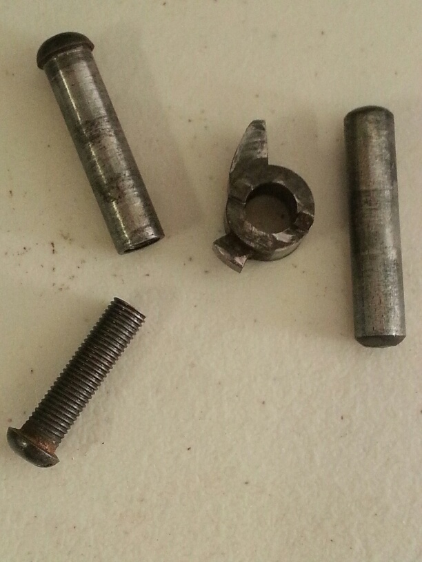 So here are the two types of roll pins that both fit the roll. The simple pin is from the Trojan. The screw and pin is from a hammerless gun. When you look at all those threads, then add moisture and 100 years you can imagine why it is so hard to undo the screw which is why we see so many buggered screw heads on the roll pin. Never really any need to remove these pins unless there is some major catastrophy.