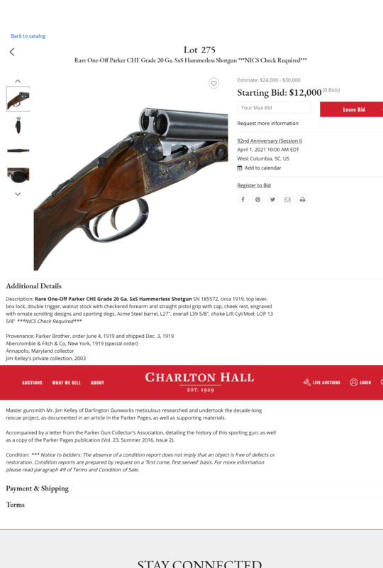 Rare One-Off Parker CHE Grade 20 Ga. SxS Hammerless Shotgun ***NICS Check Required*** View catalog Sold: $19,000 Estimate: $24,000 - $30,000 April 1, 2021 West Columbia, SC, US |