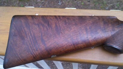 I looked up and found several ads for the show last night. The merchant that the gun was sold to, Janney Simple Hill & Co. was pretty large and a database with ledgers, accounts, and invoices exists. I may be able to uncover who the first owner was, or at least who purchased it. Here are some photos... Gotta love that figure on the stock. The wood has some love marks and normal use, but is still very much intact. The bbls shine like new but the left bbl has a dent which I may or may not have worked on. It fires my RST loads just fine. I know its a big bone on this forum, but i'd kinda like to have the bbls redone. This gun could be a real looker if the barrels were polished and the dam figure on full display. The checkering is fairly flat especially on the forend. The wood is outstanding though and if I'm going to the trouble, I would like to have a new finish. On the other hand, she's a damn fine beauty just the way she is. I'll try to post some pics with better light. |