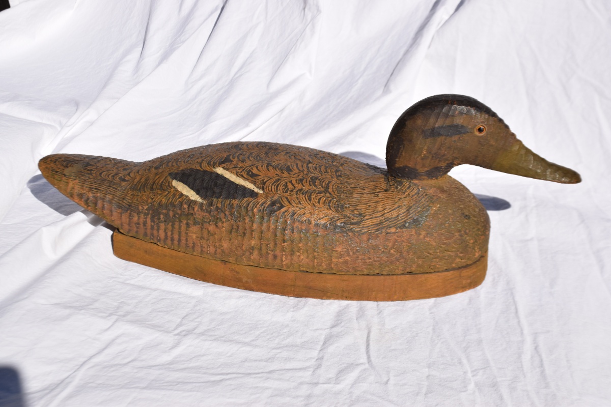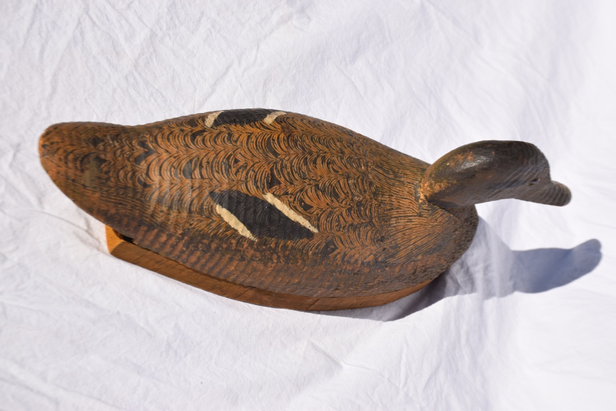 but, look at the speculum on yours - not too long and the back white line is at a steep angle and for the Pascagoula examples i see on line they almost come to a V the hen I have has a longer patch and parallel lines - much like the drake I have does (he has a few dings- but is pretty good for his age) on my two -drake's tail comes to a point and is a little thinner top to bottom- the hen's tail is a little more rounded - not to get too deep in the weeds on something as mundane as a lathe made decoy- but I love a mystery - and this gentleman was known as a serious hunter and lived just down the road from where I gun- might I be in his footsteps when a big drake comes over?