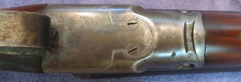 These screws are all mixed up on reassembly. Probably the rear screw was meant to be a left or right and the left or right screws are also on the wrong side. The left screw will have a straigt cut across the tip. The right screw will have no marking. The rear screw "should" have a + cut on the tip if all three screws are the same length. If one screw is obviously longer than the rest, that is the rear screw. If you remove them, and if they are the originals, for sure you will find the left screw and be able to place it in the proper hole and it should index with the slot stopping in line with the long axis of the gun, as they all should. (Left means under the left barrel btw) Here is the left screw mark. Ignore the comment on the + mark in this picture. I need to fix that. Still learning. + was a mark used to identify the rear screw when all three were of the same length. By default, the screw with no mark is the right screw, when all are the same length. Replacement screws, to my knowledge, are not marked. Have a very close look at this engraved area on the underside. That is the location for the safety slide. If it was removed welded and refinished there may be evidence of that on the underside. Or..... wait for the letter