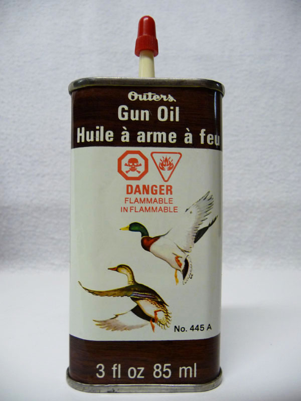 Unopened can on ebay, $34.50, no date mentioned. I haven't seen that can before, but I don't collect cans. The Outer's oil of my childhood (I am a child of the fifties), was the yellow can with black and red accents, also on ebay, but more prevalent than your can.
