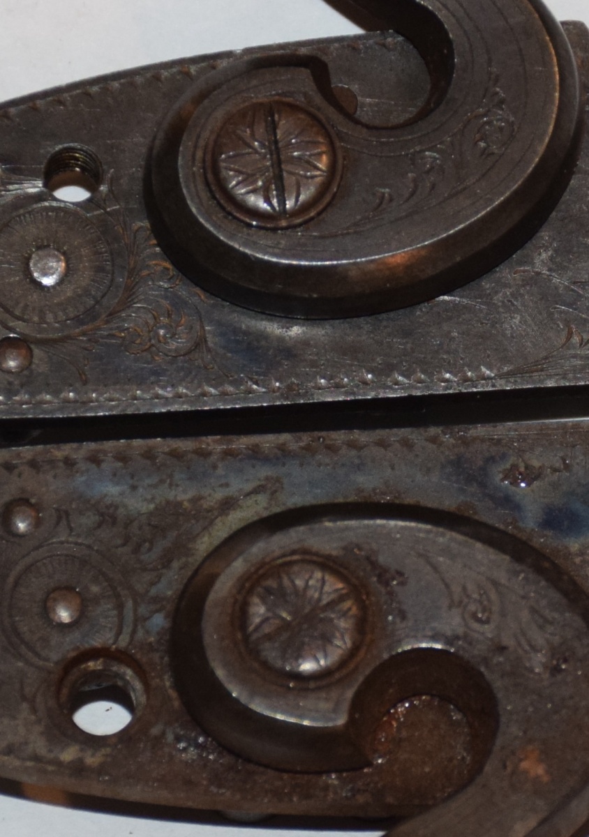 PS we all like our "unturned" screws on Parkers, and I really doubt these locks have been out of this gun since it left Meriden, but look at the picture of the insides of the locks, see the slight damage to the slot of the lower bridle screw on the left -- I DID NOT DO THAT